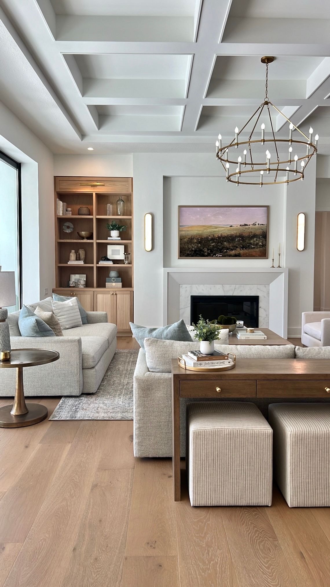 Architectural details are another clever way to distinguish spaces. A coffered or wood-beamed ceiling over the living room, for example, gives that zone its own personality. In the kitchen, a painted or shiplap ceiling can mark the area without cutting it off from the rest of the space.